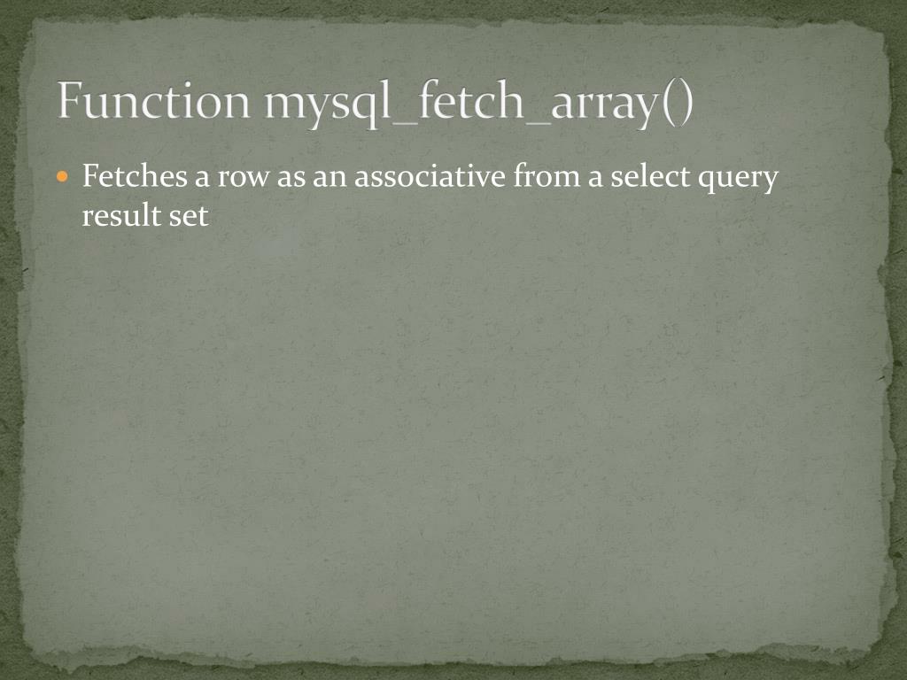 Function mysql_fetch_array() • Fetches a row as an associative from a select query result set