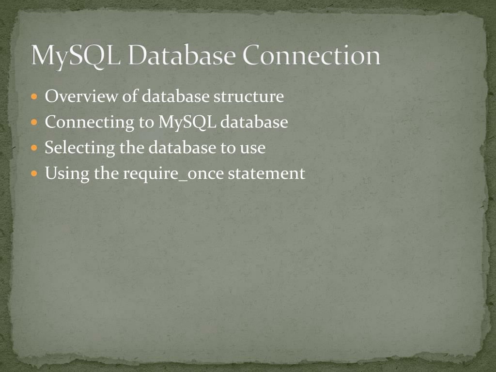 MySQL Database Connection • Overview of database structure • Connecting to MySQL database • Selecting the database to use • Using the require_once statement