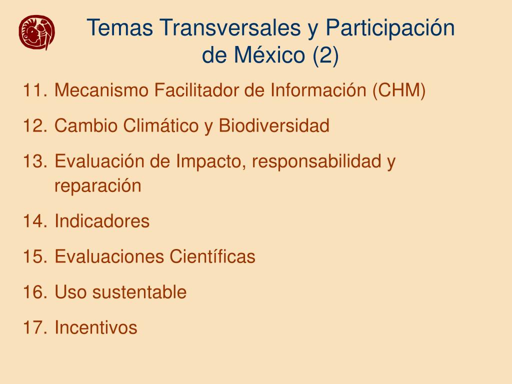 Temas Transversales y Participación de México (2) • Mecanismo Facilitador de Información (CHM) • Cambio Climático y Biodiversidad • Evaluación de Impacto, responsabilidad y reparación • Indicadores • Evaluaciones Científicas • Uso sustentable • Incentivos