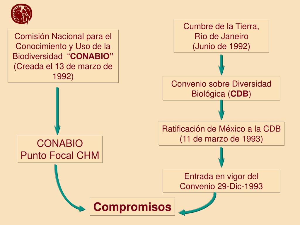 Cumbre de la Tierra, Río de Janeiro (Junio de 1992) Comisión Nacional para el Conocimiento y Uso de la Biodiversidad “CONABIO” (Creada el 13 de marzo de 1992) Convenio sobre Diversidad Biológica (CDB) Ratificación de México a la CDB (11 de marzo de 1993) CONABIO Punto Focal CHM Entrada en vigor del Convenio 29-Dic-1993 Compromisos