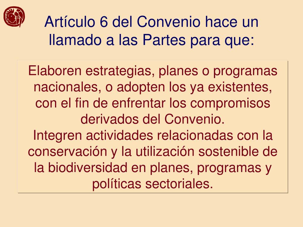Artículo 6 del Convenio hace un llamado a las Partes para que: Elaboren estrategias, planes o programas nacionales, o adopten los ya existentes, con el fin de enfrentar los compromisos derivados del Convenio. Integren actividades relacionadas con la conservación y la utilización sostenible de la biodiversidad en planes, programas y políticas sectoriales.