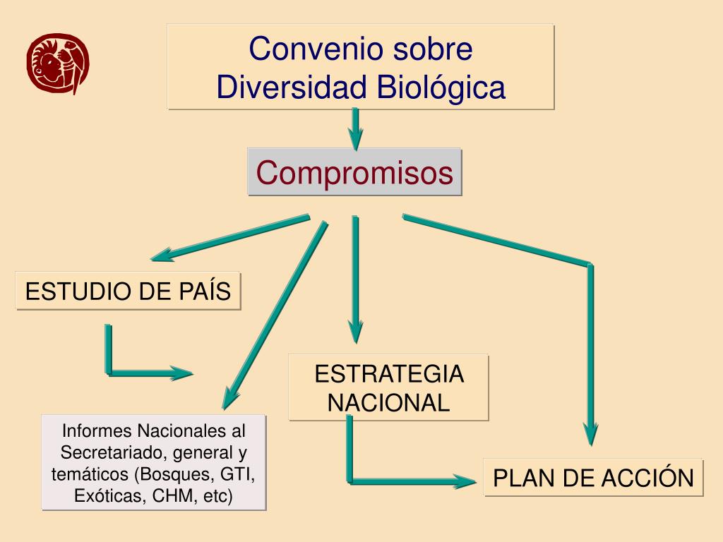 Convenio sobre Diversidad Biológica Compromisos ESTUDIO DE PAÍS ESTRATEGIA NACIONAL Informes Nacionales al Secretariado, general y temáticos (Bosques, GTI, Exóticas, CHM, etc) PLAN DE ACCIÓN