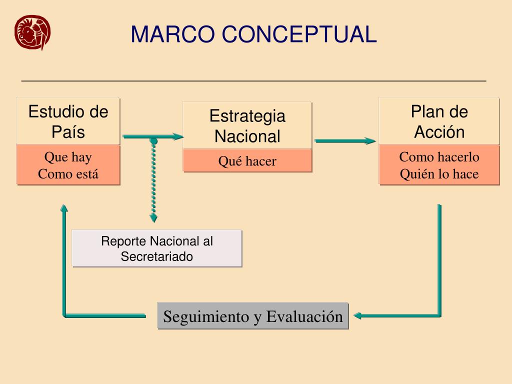 MARCO CONCEPTUAL Estudio de País Plan de Acción Estrategia Nacional Que hay Como está Como hacerlo Quién lo hace Qué hacer Reporte Nacional al Secretariado Seguimiento y Evaluación