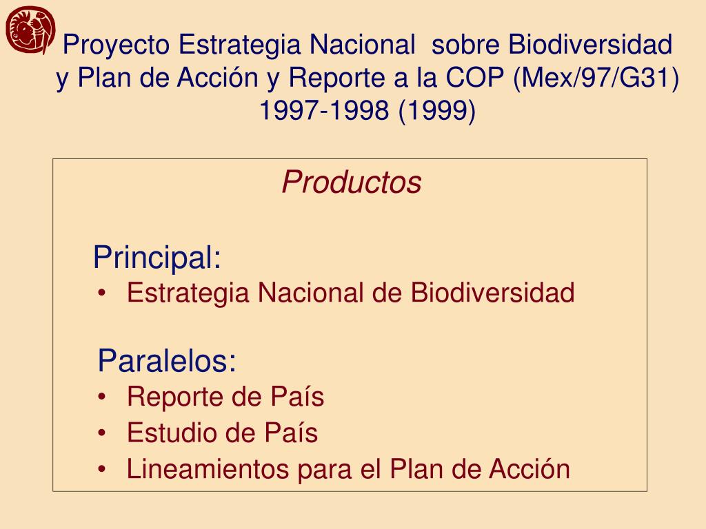 Proyecto Estrategia Nacional sobre Biodiversidad y Plan de Acción y Reporte a la COP (Mex/97/G31) 1997-1998 (1999) • Productos • Principal: • Estrategia Nacional de Biodiversidad • Paralelos: • Reporte de País • Estudio de País • Lineamientos para el Plan de Acción
