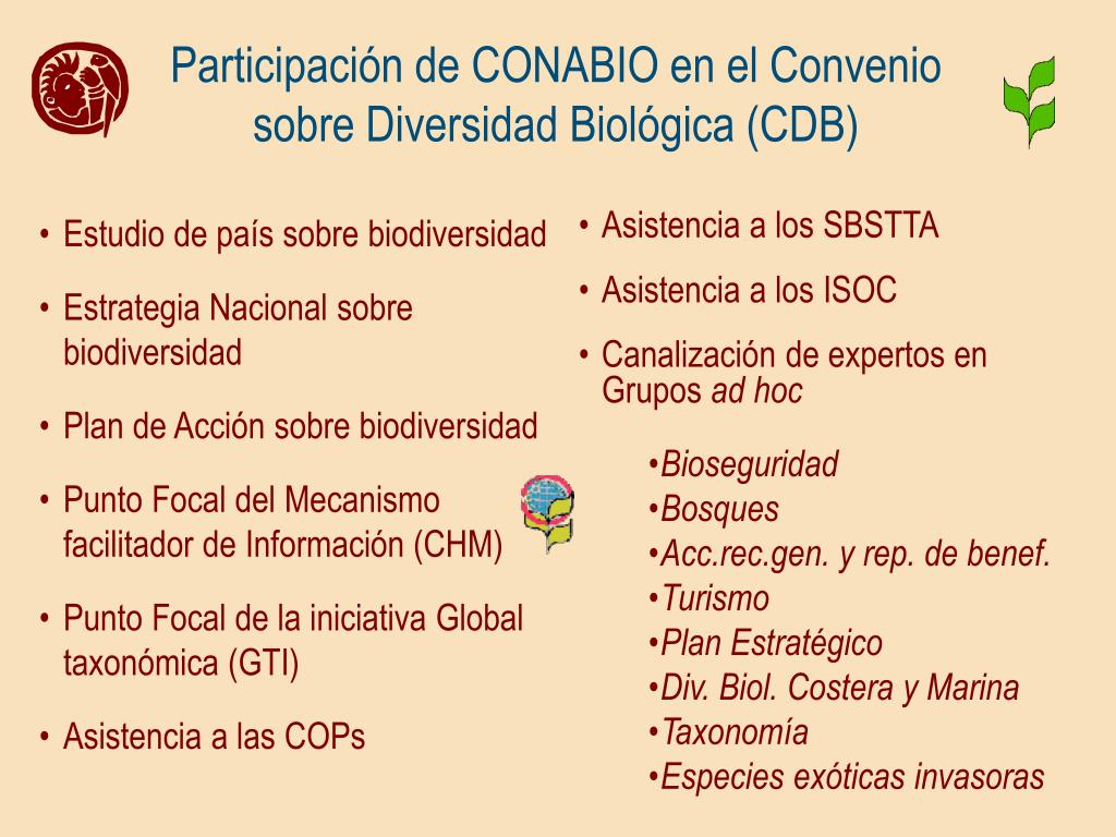 Participación de CONABIO en el Convenio sobre Diversidad Biológica (CDB) • Estudio de país sobre biodiversidad • Estrategia Nacional sobre biodiversidad • Plan de Acción sobre biodiversidad • Punto Focal del Mecanismo facilitador de Información (CHM) • Punto Focal de la iniciativa Global taxonómica (GTI) • Asistencia a las COPs • Asistencia a los SBSTTA • Asistencia a los ISOC • Canalización de expertos en Grupos ad hoc • Bioseguridad • Bosques • Acc.rec.gen. y rep. de benef. • Turismo • Plan Estratégico • Div. Biol. Costera y Marina • Taxonomía • Especies exóticas invasoras