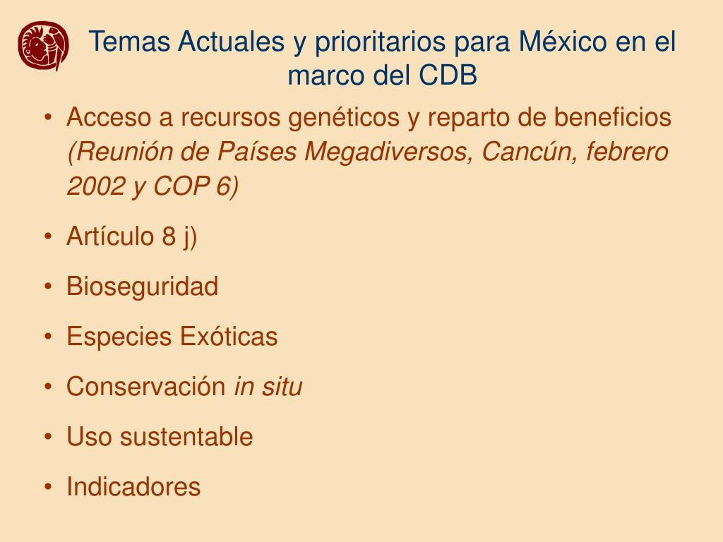 Temas Actuales y prioritarios para México en el marco del CDB • Acceso a recursos genéticos y reparto de beneficios (Reunión de Países Megadiversos, Cancún, febrero 2002 y COP 6) • Artículo 8 j) • Bioseguridad • Especies Exóticas • Conservación in situ • Uso sustentable • Indicadores
