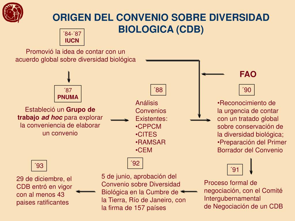 ORIGEN DEL CONVENIO SOBRE DIVERSIDAD BIOLOGICA (CDB) ´84-´87 IUCN Promovió la idea de contar con un acuerdo global sobre diversidad biológica FAO ´88 ´90 ´87 PNUMA • Análisis Convenios • Existentes: • CPPCM • CITES • RAMSAR • CEM • Reconocimiento de • la urgencia de contar • con un tratado global • sobre conservación de • la diversidad biológica; • Preparación del Primer • Borrador del Convenio Estableció un Grupo de trabajo ad hoc para explorar la conveniencia de elaborar un convenio ´92 ´93 ´91 5 de junio, aprobación del Convenio sobre Diversidad Biológica en la Cumbre de la Tierra, Río de Janeiro, con la firma de 157 países 29 de diciembre, el CDB entró en vigor con al menos 43 paises ratificantes Proceso formal de negociación, con el Comité Intergubernamental de Negociación de un CDB