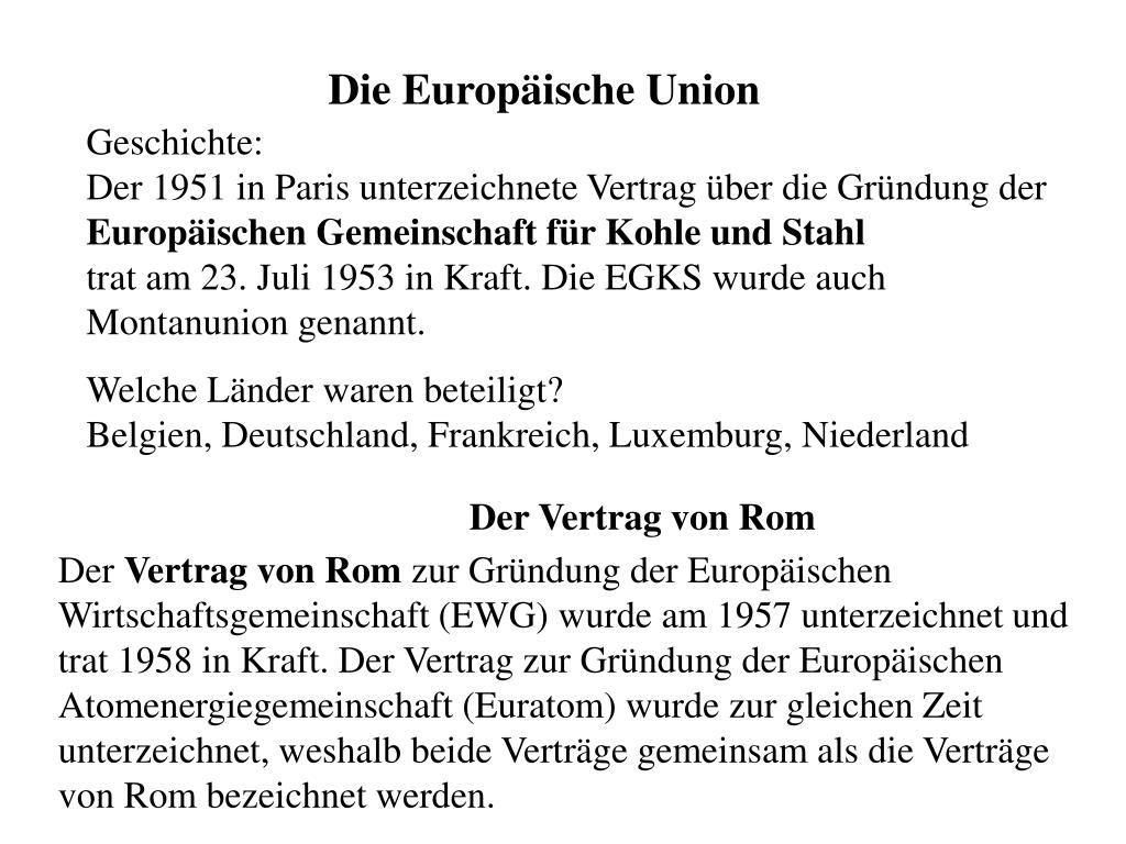 Die Europäische Union Geschichte: Der 1951 in Paris unterzeichnete Vertrag über die Gründung der Europäischen Gemeinschaft für Kohle und Stahl trat am 23. Juli 1953 in Kraft. Die EGKS wurde auch Montanunion genannt. Welche Länder waren beteiligt?Belgien, Deutschland, Frankreich, Luxemburg, Niederland • Der Vertrag von Rom • Der Vertrag von Rom zur Gründung der Europäischen Wirtschaftsgemeinschaft (EWG) wurde am 1957 unterzeichnet und trat 1958 in Kraft. Der Vertrag zur Gründung der Europäischen Atomenergiegemeinschaft (Euratom) wurde zur gleichen Zeit unterzeichnet, weshalb beide Verträge gemeinsam als die Verträge von Rom bezeichnet werden.