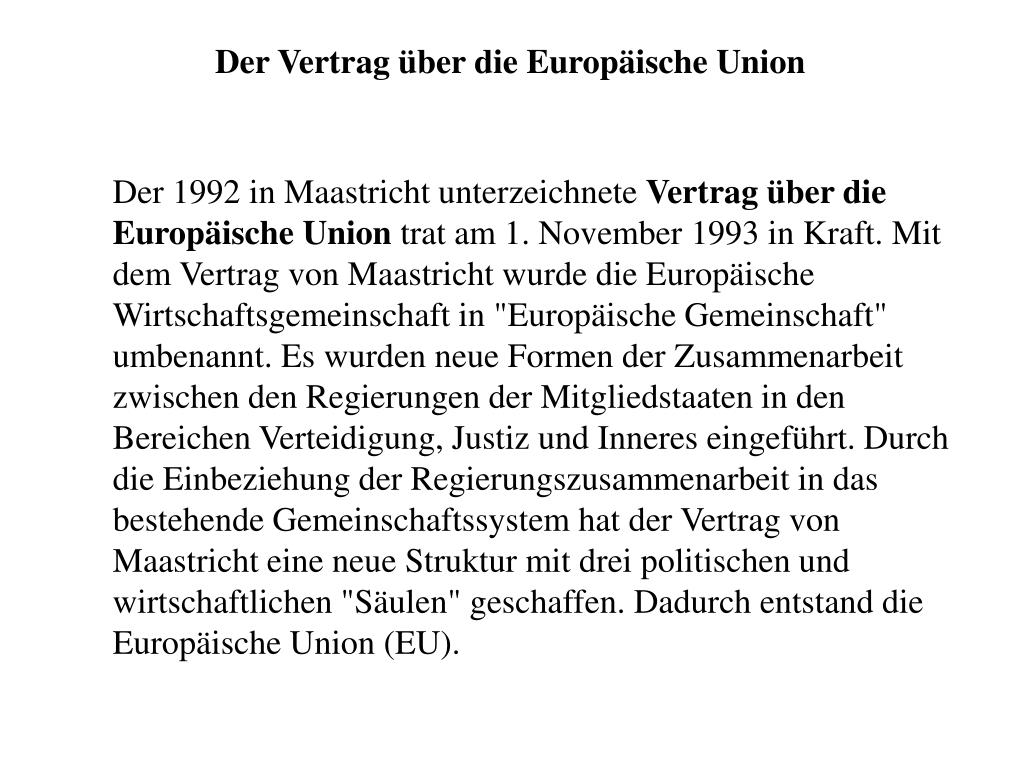 Der Vertrag über die Europäische Union • Der 1992 in Maastricht unterzeichnete Vertrag über die Europäische Union trat am 1. November 1993 in Kraft. Mit dem Vertrag von Maastricht wurde die Europäische Wirtschaftsgemeinschaft in "Europäische Gemeinschaft" umbenannt. Es wurden neue Formen der Zusammenarbeit zwischen den Regierungen der Mitgliedstaaten in den Bereichen Verteidigung, Justiz und Inneres eingeführt. Durch die Einbeziehung der Regierungszusammenarbeit in das bestehende Gemeinschaftssystem hat der Vertrag von Maastricht eine neue Struktur mit drei politischen und wirtschaftlichen "Säulen" geschaffen. Dadurch entstand die Europäische Union (EU).