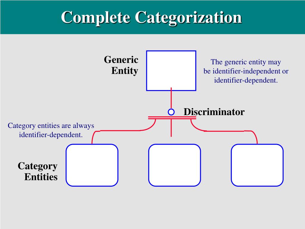 Generic Entity The generic entity may be identifier-independent or identifier-dependent. Discriminator Category Entities Complete Categorization Category entities are always identifier-dependent.