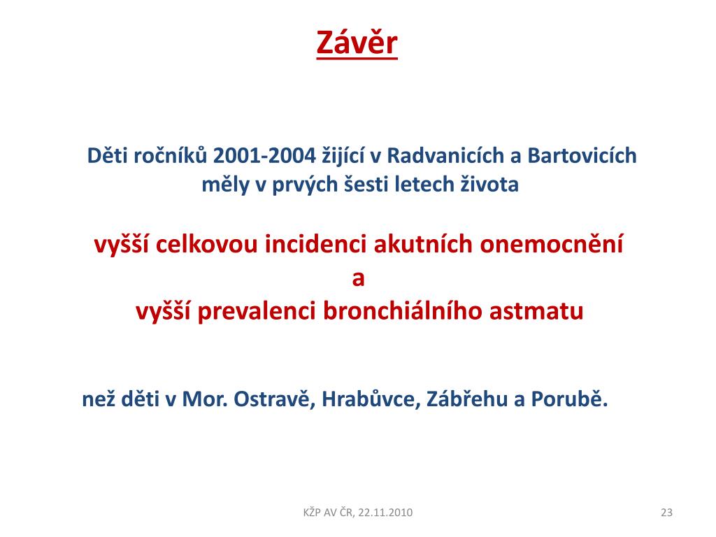 Závěr Děti ročníků 2001-2004 žijící v Radvanicích a Bartovicích měly v prvých šesti letech života vyšší celkovou incidenci akutních onemocnění a vyšší prevalenci bronchiálního astmatu než děti v Mor. Ostravě, Hrabůvce, Zábřehu a Porubě. KŽP AV ČR, 22.11.2010