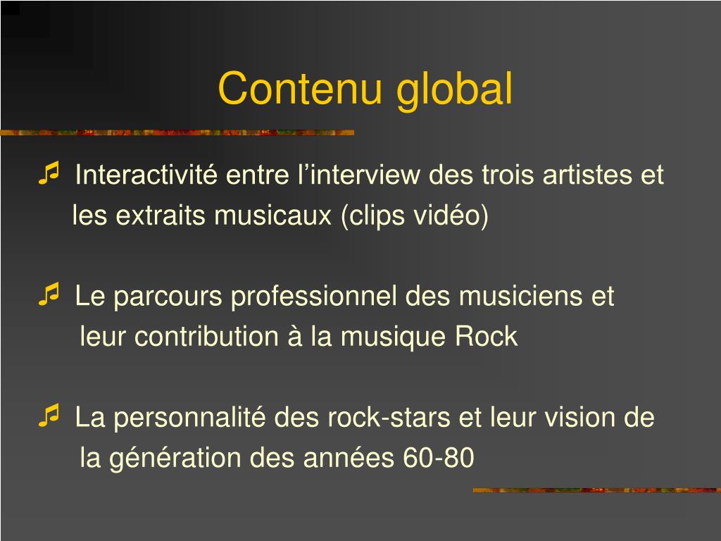 Contenu global • Interactivité entre l’interview des trois artistes et les extraits musicaux (clips vidéo) • Le parcours professionnel des musiciens et leur contribution à la musique Rock • La personnalité des rock-stars et leur vision de la génération des années 60-80