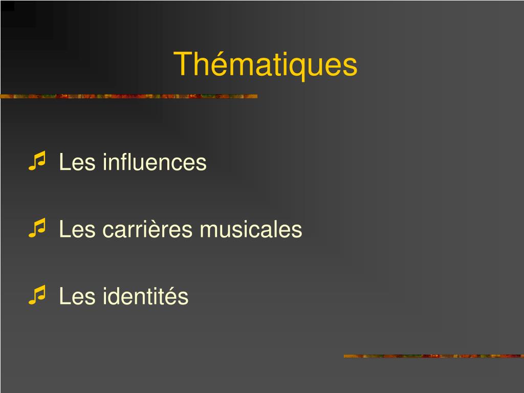 Thématiques • Les influences • Les carrières musicales • Les identités
