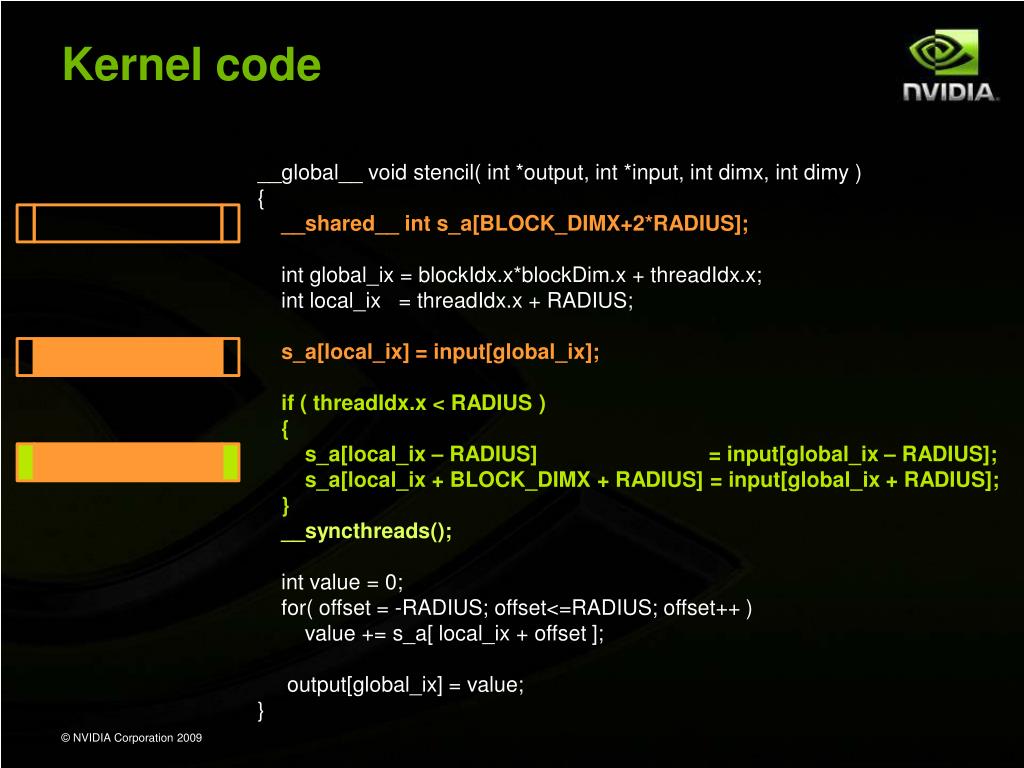 Kernel code __global__ void stencil( int *output, int *input, intdimx, intdimy ) { __shared__ ints_a[BLOCK_DIMX+2*RADIUS]; intglobal_ix = blockIdx.x*blockDim.x + threadIdx.x; intlocal_ix = threadIdx.x + RADIUS; s_a[local_ix] = input[global_ix]; if ( threadIdx.x < RADIUS ) { s_a[local_ix – RADIUS] = input[global_ix – RADIUS]; s_a[local_ix + BLOCK_DIMX + RADIUS] = input[global_ix + RADIUS]; } __syncthreads(); int value = 0; for( offset = -RADIUS; offset<=RADIUS; offset++ ) value += s_a[ local_ix + offset ]; output[global_ix] = value; }