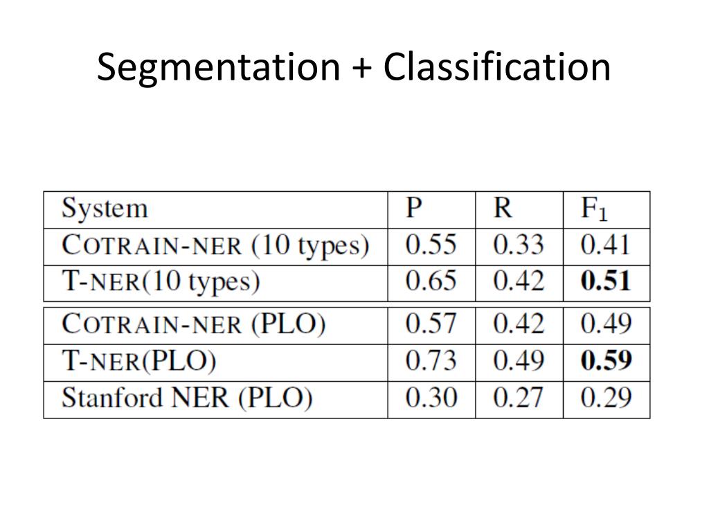 Named Entity Segmentation • Off the shelf taggers perform poorly • Stanford NER: F1=0.44 not including classification