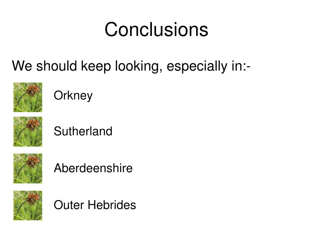Conclusions We should keep looking, especially in:- Orkney Sutherland Aberdeenshire Outer Hebrides