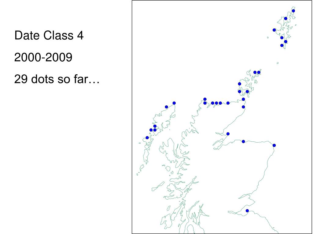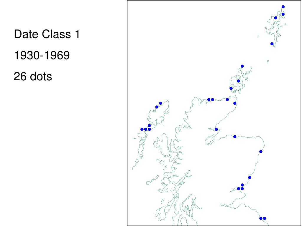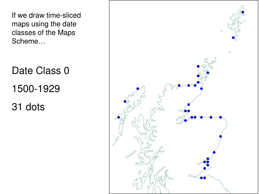 If we draw time-sliced maps using the date classes of the Maps Scheme… Date Class 0 1500-1929 31 dots