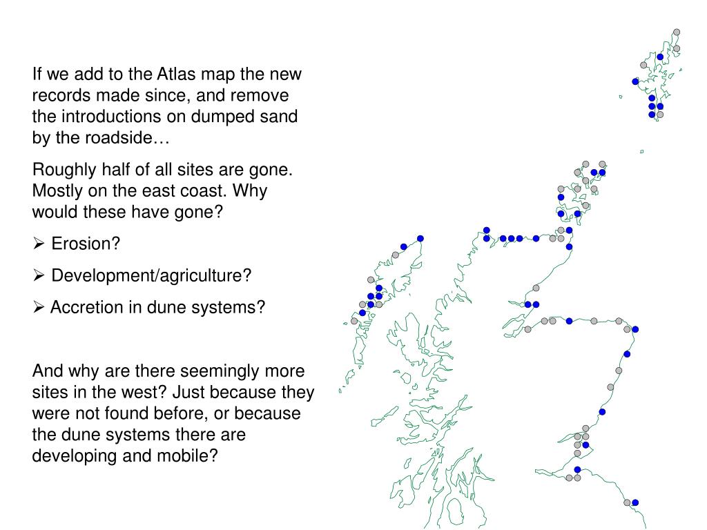 If we add to the Atlas map the new records made since, and remove the introductions on dumped sand by the roadside… • Roughly half of all sites are gone. Mostly on the east coast. Why would these have gone? • Erosion? • Development/agriculture? • Accretion in dune systems? • And why are there seemingly more sites in the west? Just because they were not found before, or because the dune systems there are developing and mobile?