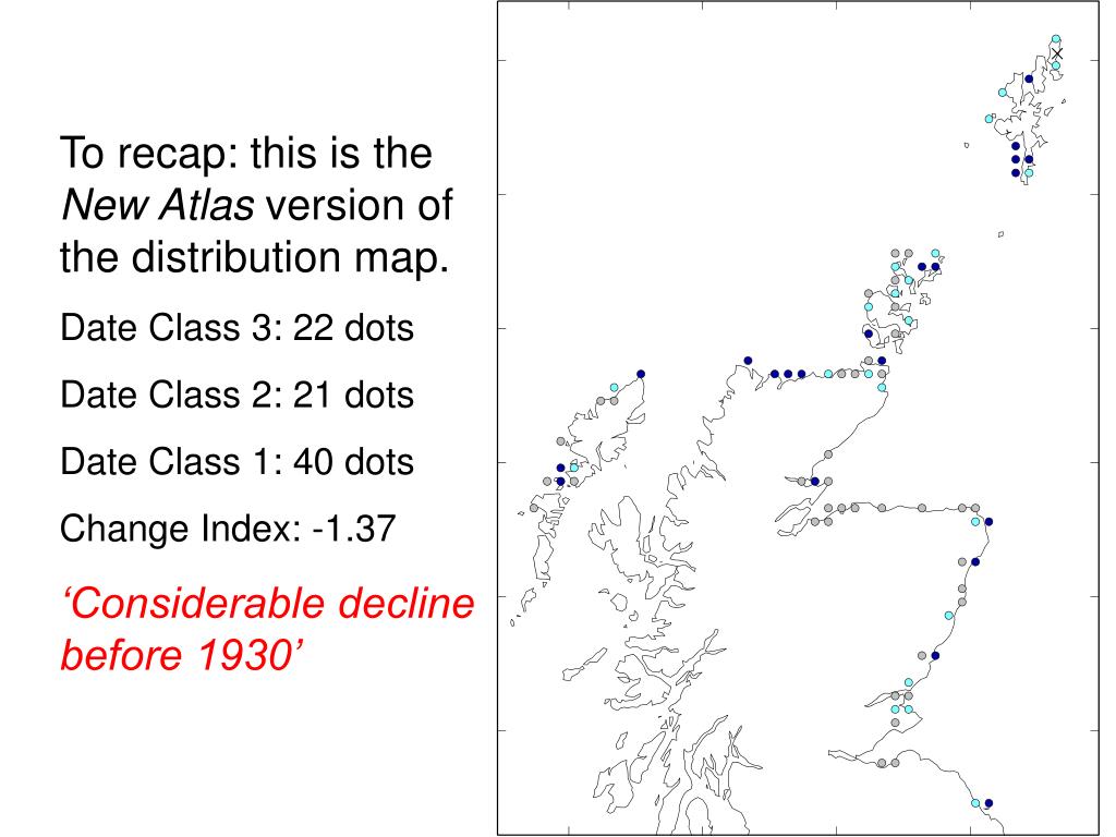 To recap: this is the New Atlas version of the distribution map. Date Class 3: 22 dots Date Class 2: 21 dots Date Class 1: 40 dots Change Index: -1.37 ‘Considerable decline before 1930’