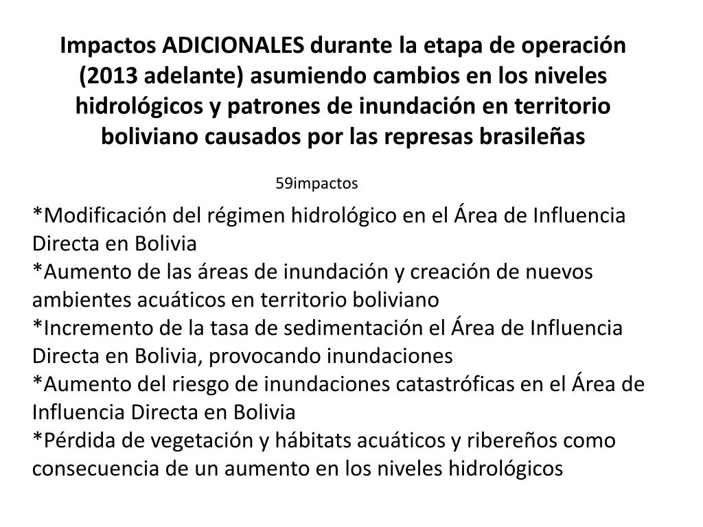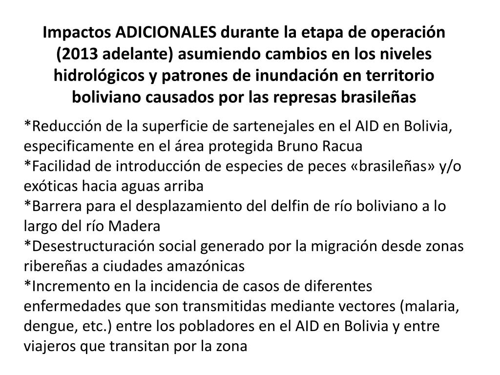 Impactos ADICIONALES durante la etapa de operación (2013 adelante) asumiendo cambios en los niveles hidrológicos y patrones de inundación en territorio boliviano causados por las represas brasileñas *Reducción de la superficie de sartenejales en el AID en Bolivia, especificamente en el área protegida Bruno Racua *Facilidad de introducción de especies de peces «brasileñas» y/o exóticas hacia aguas arriba *Barrera para el desplazamiento del delfin de río boliviano a lo largo del río Madera *Desestructuración social generado por la migración desde zonas ribereñas a ciudades amazónicas *Incremento en la incidencia de casos de diferentes enfermedades que son transmitidas mediante vectores (malaria, dengue, etc.) entre los pobladores en el AID en Bolivia y entre viajeros que transitan por la zona