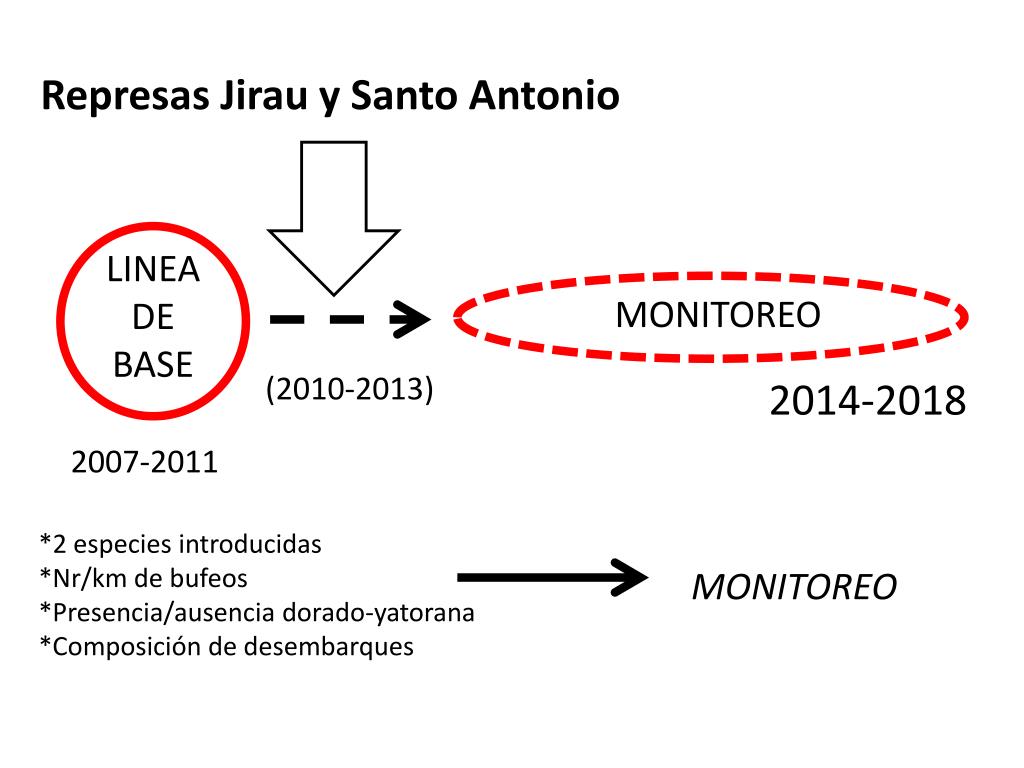 Represas Jirau y Santo Antonio LINEA DE BASE MONITOREO (2010-2013) 2014-2018 2007-2011 *2 especies introducidas *Nr/km de bufeos *Presencia/ausencia dorado-yatorana *Composición de desembarques MONITOREO