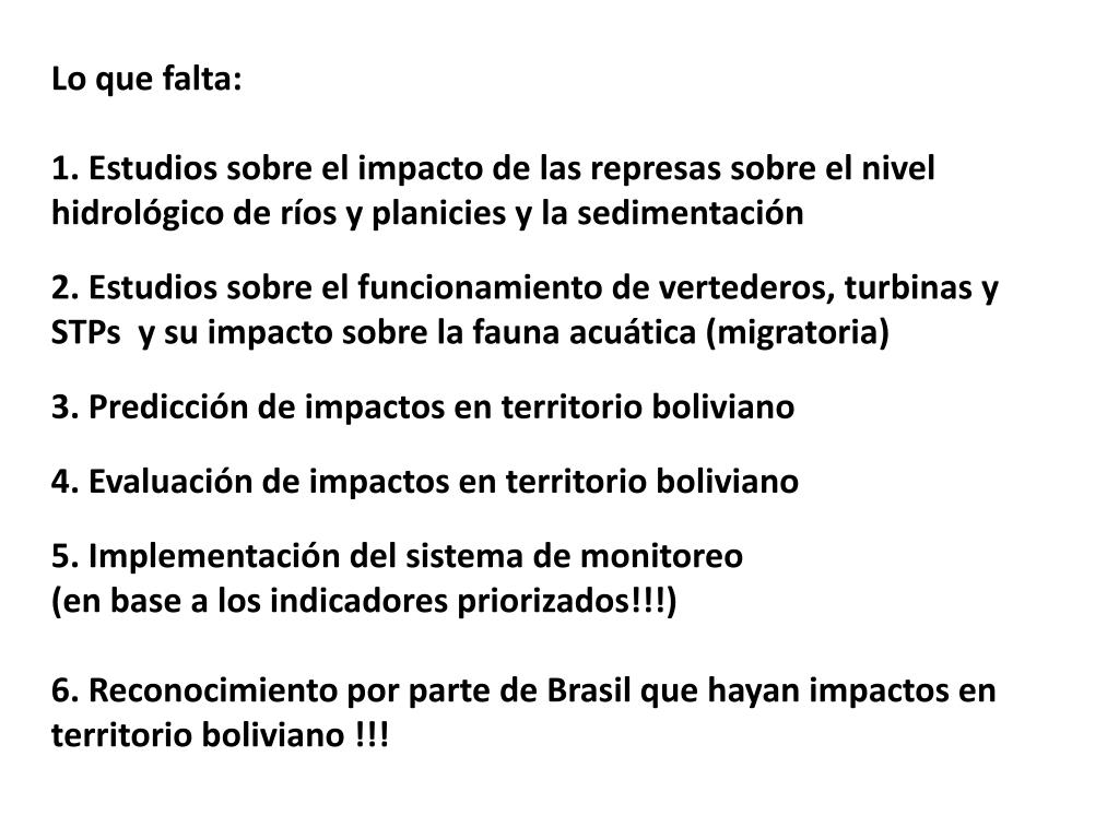 Lo que falta: 1. Estudios sobre el impacto de las represas sobre el nivel hidrológico de ríos y planicies y la sedimentación 2. Estudios sobre el funcionamiento de vertederos, turbinas y STPs y su impacto sobre la fauna acuática (migratoria) 3. Predicción de impactos en territorio boliviano 4. Evaluación de impactos en territorio boliviano 5. Implementación del sistema de monitoreo (en base a los indicadores priorizados!!!) 6. Reconocimiento por parte de Brasil que hayan impactos en territorio boliviano !!!