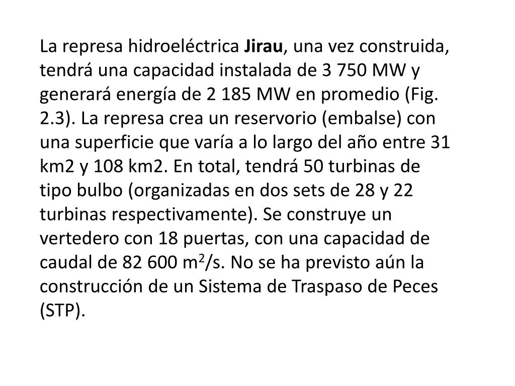 La represa hidroeléctrica Jirau, una vez construida, tendrá una capacidad instalada de 3 750 MW y generará energía de 2 185 MW en promedio (Fig. 2.3). La represa crea un reservorio (embalse) con una superficie que varía a lo largo del año entre 31 km2 y 108 km2. En total, tendrá 50 turbinas de tipo bulbo (organizadas en dos sets de 28 y 22 turbinas respectivamente). Se construye un vertedero con 18 puertas, con una capacidad de caudal de 82 600 m2/s. No se ha previsto aún la construcción de un Sistema de Traspaso de Peces (STP).