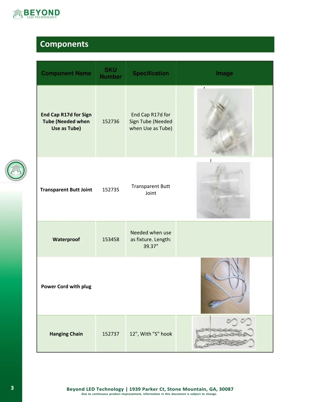 Components SKU Number Component Name Specification Image End Cap R17d for Sign Tube (Needed when Use as Tube) End Cap R17d for Sign Tube (Needed when Use as Tube) 152736 Transparent Butt Joint Transparent Butt Joint 152735 Needed when use as fixture. Length: 39.37" Waterproof 153458 Power Cord with plug Hanging Chain 152737 12", With "S" hook Beyond LED Technology | 1939 Parker Ct, Stone Mountain, GA, 30087 Due to continuous product improvement, information in this document is subject to change.
