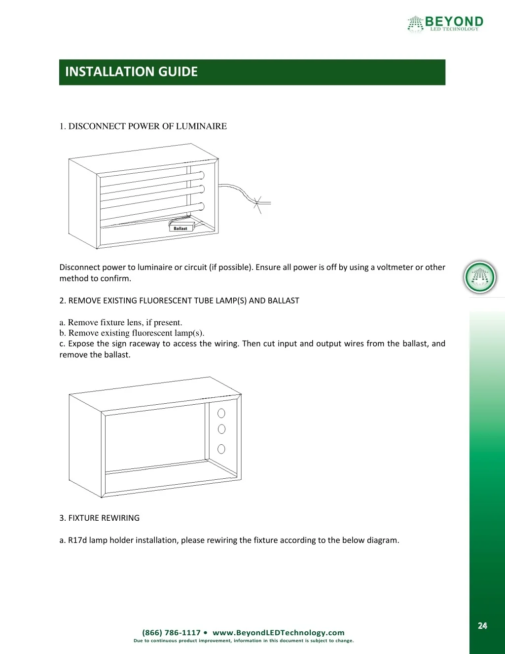 INSTALLATION GUIDE 1. DISCONNECT POWER OF LUMINAIRE Disconnect power to luminaire or circuit (if possible). Ensure all power is off by using a voltmeter or other method to confirm. 2. REMOVE EXISTING FLUORESCENT TUBE LAMP(S) AND BALLAST a. Remove fixture lens, if present. b. Remove existing fluorescent lamp(s). c. Expose the sign raceway to access the wiring. Then cut input and output wires from the ballast, and remove the ballast. 3. FIXTURE REWIRING a. R17d lamp holder installation, please rewiring the fixture according to the below diagram. (866) 786-1117 • www.BeyondLEDTechnology.com Due to continuous product improvement, information in this document is subject to change.