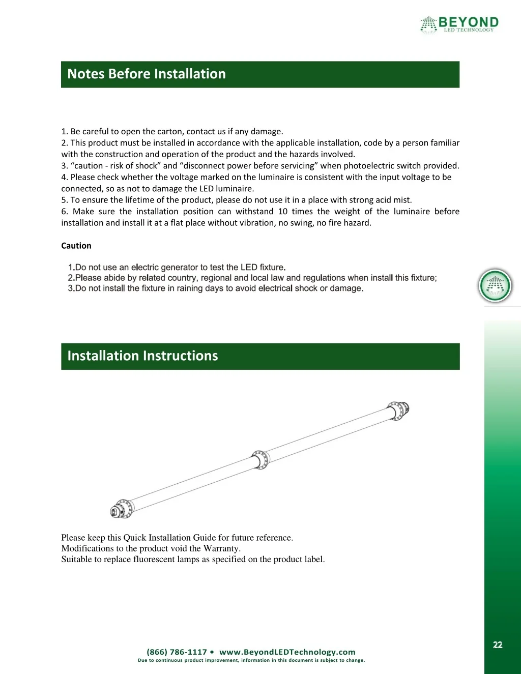Notes Before Installation 1. Be careful to open the carton, contact us if any damage. 2. This product must be installed in accordance with the applicable installation, code by a person familiar with the construction and operation of the product and the hazards involved. 3. “caution - risk of shock” and “disconnect power before servicing” when photoelectric switch provided. 4. Please check whether the voltage marked on the luminaire is consistent with the input voltage to be connected, so as not to damage the LED luminaire. 5. To ensure the lifetime of the product, please do not use it in a place with strong acid mist. 6. Make sure the installation position can withstand 10 times the weight of the luminaire before installation and install it at a flat place without vibration, no swing, no fire hazard. Caution Installation Instructions Please keep this Quick Installation Guide for future reference. Modifications to the product void the Warranty. Suitable to replace fluorescent lamps as specified on the product label. (866) 786-1117 • www.BeyondLEDTechnology.com Due to continuous product improvement, information in this document is subject to change.