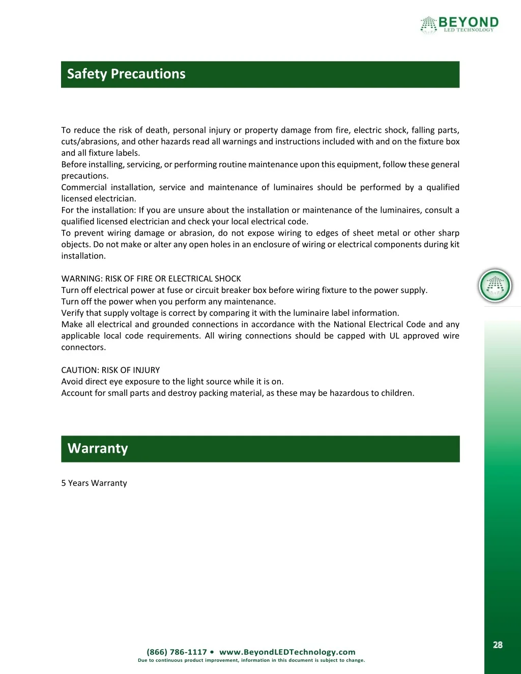 Safety Precautions To reduce the risk of death, personal injury or property damage from fire, electric shock, falling parts, cuts/abrasions, and other hazards read all warnings and instructions included with and on the fixture box and all fixture labels. Before installing, servicing, or performing routine maintenance upon this equipment, follow these general precautions. Commercial installation, service and maintenance of luminaires should be performed by a qualified licensed electrician. For the installation: If you are unsure about the installation or maintenance of the luminaires, consult a qualified licensed electrician and check your local electrical code. To prevent wiring damage or abrasion, do not expose wiring to edges of sheet metal or other sharp objects. Do not make or alter any open holes in an enclosure of wiring or electrical components during kit installation. WARNING: RISK OF FIRE OR ELECTRICAL SHOCK Turn off electrical power at fuse or circuit breaker box before wiring fixture to the power supply. Turn off the power when you perform any maintenance. Verify that supply voltage is correct by comparing it with the luminaire label information. Make all electrical and grounded connections in accordance with the National Electrical Code and any applicable local code requirements. All wiring connections should be capped with UL approved wire connectors. CAUTION: RISK OF INJURY Avoid direct eye exposure to the light source while it is on. Account for small parts and destroy packing material, as these may be hazardous to children. Warranty 5 Years Warranty (866) 786-1117 • www.BeyondLEDTechnology.com Due to continuous product improvement, information in this document is subject to change.