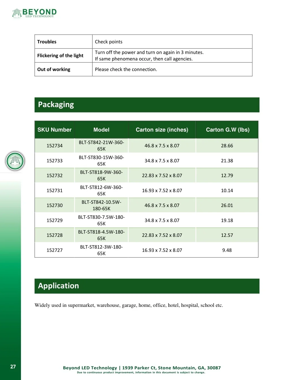 Troubles Check points Turn off the power and turn on again in 3 minutes. If same phenomena occur, then call agencies. Flickering of the light Out of working Please check the connection. Packaging SKU Number Model Carton size (inches) Carton G.W (lbs) BLT-ST842-21W-360- 65K 152734 46.8 x 7.5 x 8.07 28.66 BLT-ST830-15W-360- 65K 152733 34.8 x 7.5 x 8.07 21.38 BLT-ST818-9W-360- 65K 152732 22.83 x 7.52 x 8.07 12.79 BLT-ST812-6W-360- 65K 152731 16.93 x 7.52 x 8.07 10.14 BLT-ST842-10.5W- 180-65K 152730 46.8 x 7.5 x 8.07 26.01 BLT-ST830-7.5W-180- 65K 152729 34.8 x 7.5 x 8.07 19.18 BLT-ST818-4.5W-180- 65K 152728 22.83 x 7.52 x 8.07 12.57 BLT-ST812-3W-180- 65K 152727 16.93 x 7.52 x 8.07 9.48 Application Widely used in supermarket, warehouse, garage, home, office, hotel, hospital, school etc. Beyond LED Technology | 1939 Parker Ct, Stone Mountain, GA, 30087 Due to continuous product improvement, information in this document is subject to change.