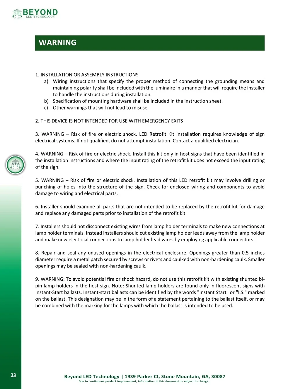 WARNING 1. INSTALLATION OR ASSEMBLY INSTRUCTIONS a)Wiring instructions that specify the proper method of connecting the grounding means and maintaining polarity shall be included with the luminaire in a manner that will require the installer to handle the instructions during installation. b)Specification of mounting hardware shall be included in the instruction sheet. c)Other warnings that will not lead to misuse. 2. THIS DEVICE IS NOT INTENDED FOR USE WITH EMERGENCY EXITS 3. WARNING – Risk of fire or electric shock. LED Retrofit Kit installation requires knowledge of sign electrical systems. If not qualified, do not attempt installation. Contact a qualified electrician. 4. WARNING – Risk of fire or electric shock. Install this kit only in host signs that have been identified in the installation instructions and where the input rating of the retrofit kit does not exceed the input rating of the sign. 5. WARNING – Risk of fire or electric shock. Installation of this LED retrofit kit may involve drilling or punching of holes into the structure of the sign. Check for enclosed wiring and components to avoid damage to wiring and electrical parts. 6. Installer should examine all parts that are not intended to be replaced by the retrofit kit for damage and replace any damaged parts prior to installation of the retrofit kit. 7. Installers should not disconnect existing wires from lamp holder terminals to make new connections at lamp holder terminals. Instead installers should cut existing lamp holder leads away from the lamp holder and make new electrical connections to lamp holder lead wires by employing applicable connectors. 8. Repair and seal any unused openings in the electrical enclosure. Openings greater than 0.5 inches diameter require a metal patch secured by screws or rivets and caulked with non-hardening caulk. Smaller openings may be sealed with non-hardening caulk. 9. WARNING: To avoid potential fire or shock hazard, do not use this retrofit kit with existing shunted bi- pin lamp holders in the host sign. Note: Shunted lamp holders are found only in fluorescent signs with Instant-Start ballasts. Instant-start ballasts can be identified by the words "Instant Start" or "I.S." marked on the ballast. This designation may be in the form of a statement pertaining to the ballast itself, or may be combined with the marking for the lamps with which the ballast is intended to be used. Beyond LED Technology | 1939 Parker Ct, Stone Mountain, GA, 30087 Due to continuous product improvement, information in this document is subject to change.
