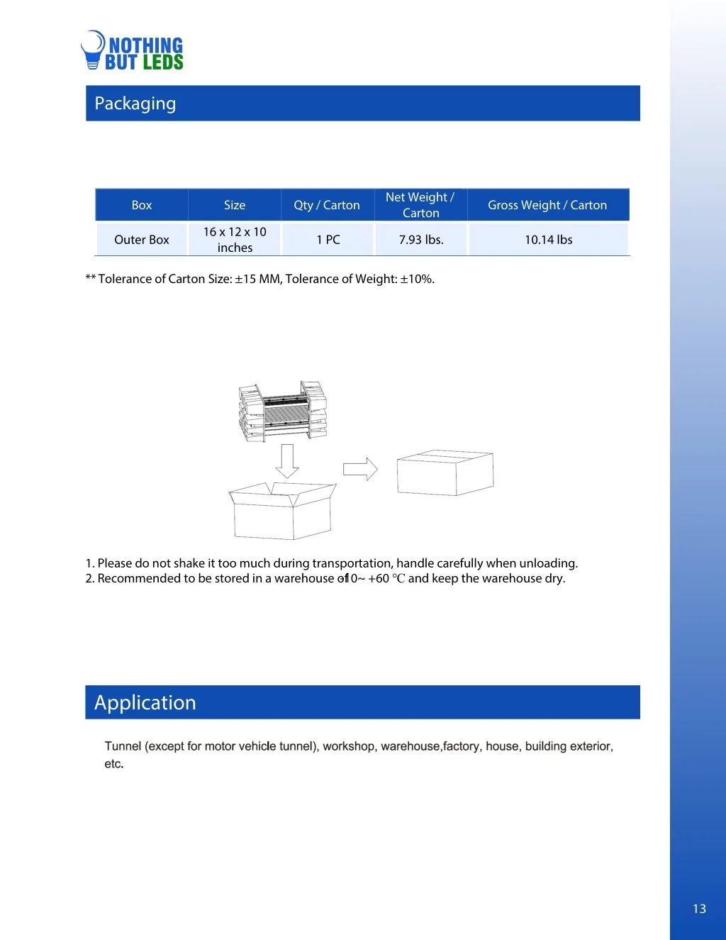 Packaging Net Weight / Carton Box Size Qty / Carton Gross Weight / Carton 16 x 12 x 10 inches Outer Box 1 PC 7.93 lbs. 10.14 lbs **Tolerance of Carton Size: ±15 MM, Tolerance of Weight: ±10%. 1. Please do not shake it too much during transportation, handle carefully when unloading. 2. Recommended to be stored in a warehouse of -10~ +60 ℃ and keep the warehouse dry. Application 13