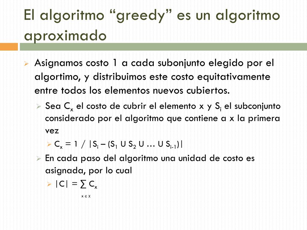 El algoritmo “greedy” es un algoritmoaproximado • Asignamoscosto 1 a cadasubonjuntoelegidopor el algortimo, y distribuimosestecostoequitativamente entre todos los elementosnuevoscubiertos. • Sea Cx el costo de cubrir el elemento x y Si el subconjuntoconsideradopor el algoritmoquecontiene a x la primeravez • Cx = 1 / |Si – (S1 U S2 U … U Si-1)| • En cadapaso del algoritmounaunidad de costoesasignada, por lo cual • |C| = ∑ Cx x ∈ X