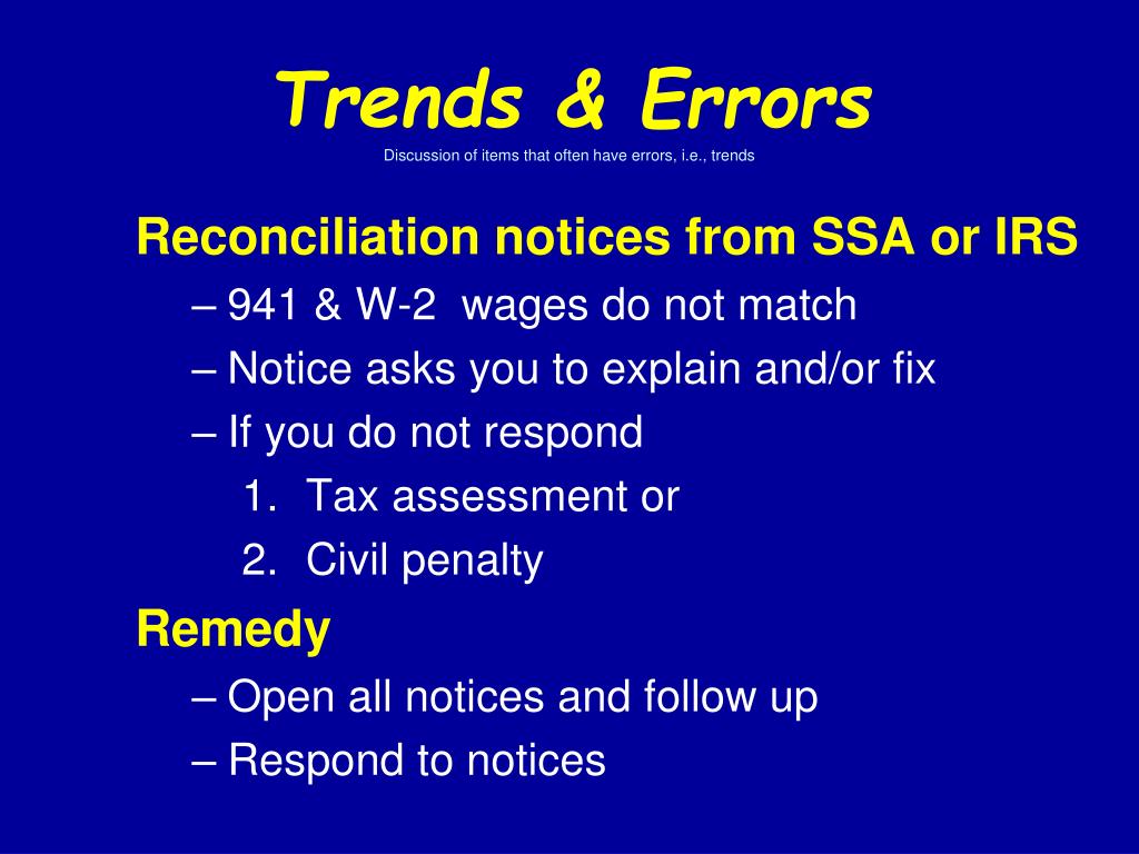 Trends & ErrorsDiscussion of items that often have errors, i.e., trends Reconciliation notices from SSA or IRS • 941 & W-2 wages do not match • Notice asks you to explain and/or fix • If you do not respond • Tax assessment or • Civil penalty Remedy • Open all notices and follow up • Respond to notices