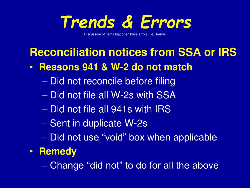 Trends & ErrorsDiscussion of items that often have errors, i.e., trends Reconciliation notices from SSA or IRS • Reasons 941 & W-2 do not match • Did not reconcile before filing • Did not file all W-2s with SSA • Did not file all 941s with IRS • Sent in duplicate W-2s • Did not use “void” box when applicable • Remedy • Change “did not” to do for all the above