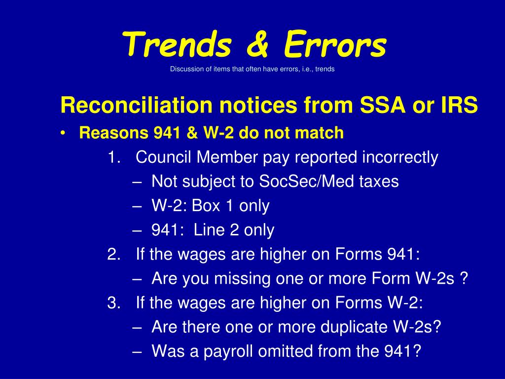 Trends & ErrorsDiscussion of items that often have errors, i.e., trends Reconciliation notices from SSA or IRS • Reasons 941 & W-2 do not match • Council Member pay reported incorrectly • Not subject to SocSec/Med taxes • W-2: Box 1 only • 941: Line 2 only • If the wages are higher on Forms 941: • Are you missing one or more Form W-2s ? • If the wages are higher on Forms W-2: • Are there one or more duplicate W-2s? • Was a payroll omitted from the 941?
