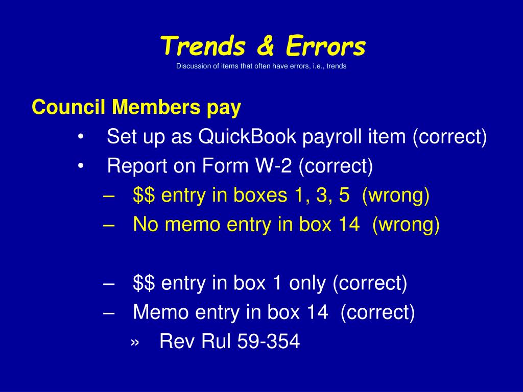 Trends & ErrorsDiscussion of items that often have errors, i.e., trends Council Members pay • Set up as QuickBook payroll item (correct) • Report on Form W-2 (correct) • $$ entry in boxes 1, 3, 5 (wrong) • No memo entry in box 14 (wrong) • $$ entry in box 1 only (correct) • Memo entry in box 14 (correct) • Rev Rul 59-354