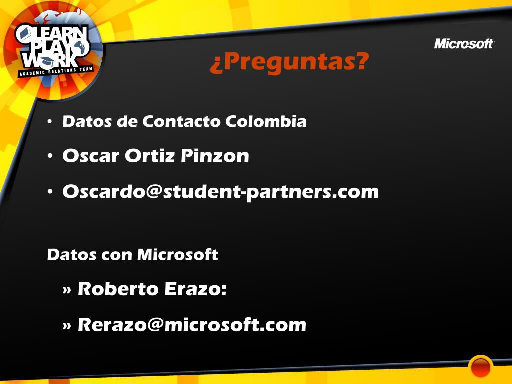 ¿Preguntas? • Datos de Contacto Colombia • Oscar Ortiz Pinzon • Oscardo@student-partners.com • Datos con Microsoft • Roberto Erazo: • Rerazo@microsoft.com
