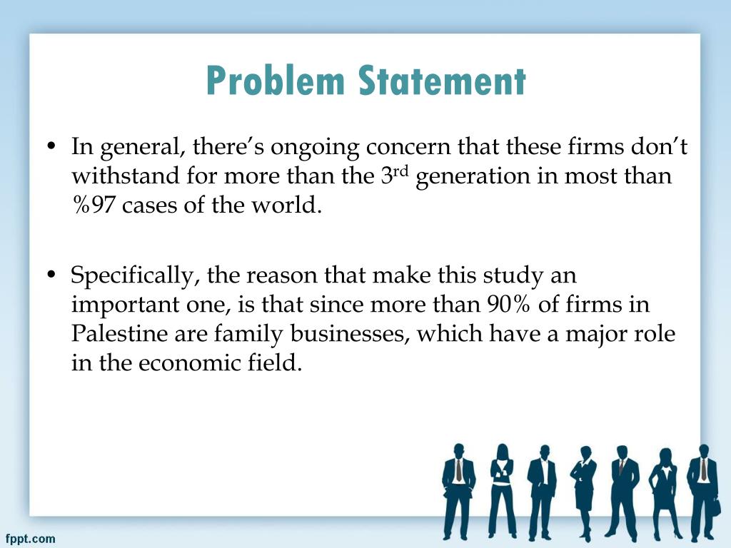 Problem Statement • In general, there’s ongoing concern that these firms don’t withstand for more than the 3rd generation in most than %97 cases of the world. • Specifically, the reason that make this study an important one, is that since more than 90% of firms in Palestine are family businesses, which have a major role in the economic field.