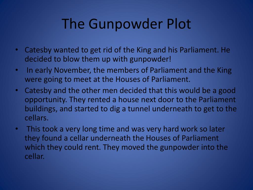 The Gunpowder Plot • Catesby wanted to get rid of the King and his Parliament. He decided to blow them up with gunpowder! • In early November, the members of Parliament and the King were going to meet at the Houses of Parliament. • Catesby and the other men decided that this would be a good opportunity. They rented a house next door to the Parliament buildings, and started to dig a tunnel underneath to get to the cellars. • This took a very long time and was very hard work so later they found a cellar underneath the Houses of Parliament which they could rent. They moved the gunpowder into the cellar.