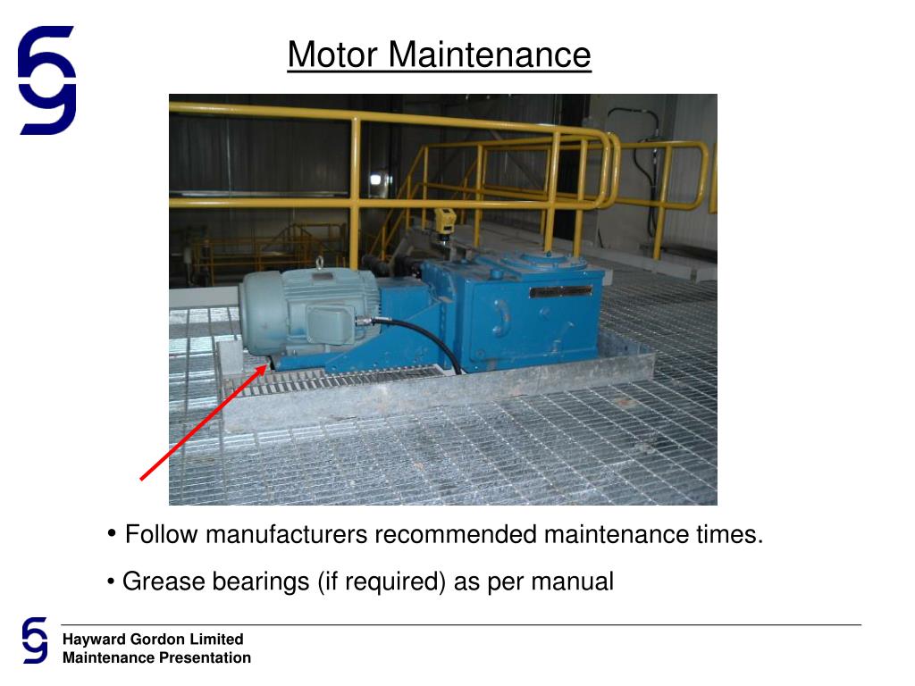 Motor Maintenance • Follow manufacturers recommended maintenance times. • Grease bearings (if required) as per manual