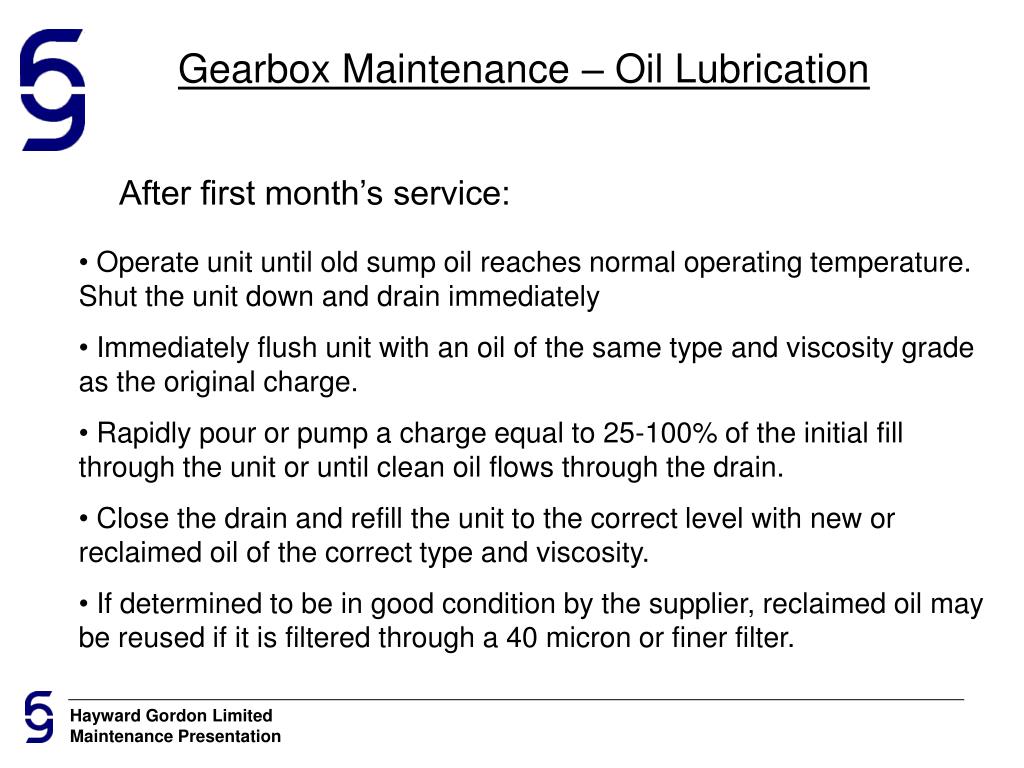 Gearbox Maintenance – Oil Lubrication After first month’s service: • Operate unit until old sump oil reaches normal operating temperature. Shut the unit down and drain immediately • Immediately flush unit with an oil of the same type and viscosity grade as the original charge. • Rapidly pour or pump a charge equal to 25-100% of the initial fill through the unit or until clean oil flows through the drain. • Close the drain and refill the unit to the correct level with new or reclaimed oil of the correct type and viscosity. • If determined to be in good condition by the supplier, reclaimed oil may be reused if it is filtered through a 40 micron or finer filter.