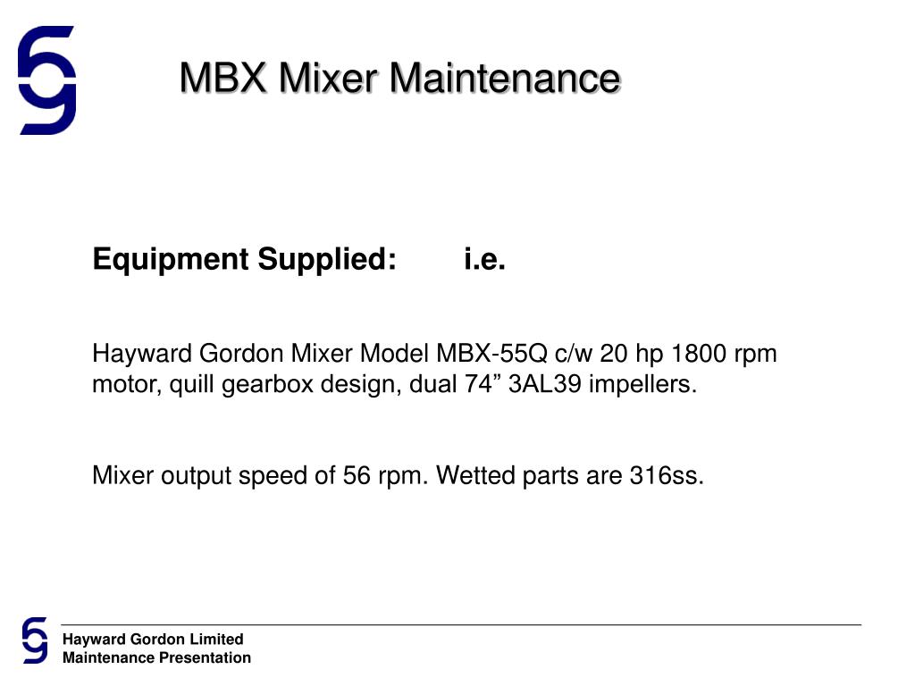 Hayward Gordon Mixer Maintenance Training Presentation. Project: ? Equipment: ?. MBX Mixer Maintenance. Equipment Supplied: i.e. Hayward Gordon Mixer Model MBX-55Q c/w 20 hp 1800 rpm motor, quill gearbox design, dual 74” 3AL39 impellers.