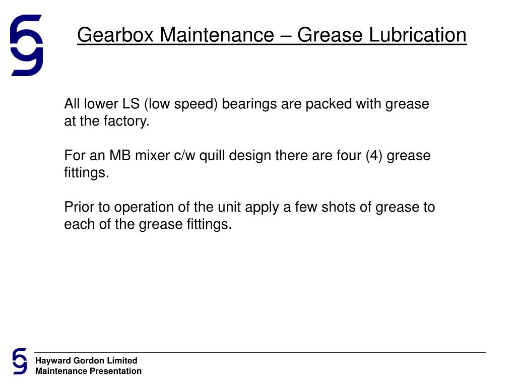 Gearbox Maintenance – Grease Lubrication All lower LS (low speed) bearings are packed with grease at the factory. For an MB mixer c/w quill design there are four (4) grease fittings. Prior to operation of the unit apply a few shots of grease to each of the grease fittings.