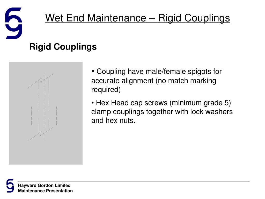 Wet End Maintenance – Rigid Couplings Rigid Couplings • Coupling have male/female spigots for accurate alignment (no match marking required) • Hex Head cap screws (minimum grade 5) clamp couplings together with lock washers and hex nuts.
