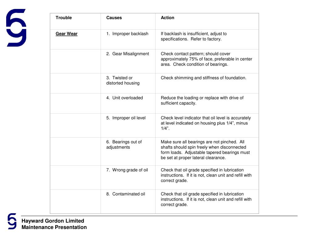 Trouble Causes Action Gear Wear 1. Improper backlash If backlash is insufficient, adjust to specifications. Refer to factory. 2. Gear Misalignment Check contact pattern; should cover approximately 75% of face, preferable in center area. Check condition of bearings. 3. Twisted or distorted housing Check shimming and stiffness of foundation. 4. Unit overloaded Reduce the loading or replace with drive of sufficient capacity. 5. Improper oil level Check level indicator that oil level is accurately at level indicated on housing plus 1/4”, minus 1/4”. 6. Bearings out of adjustments Make sure all bearings are not pinched. All shafts should spin freely when disconnected form loads. Adjustable tapered bearings must be set at proper lateral clearance. 7. Wrong grade of oil Check that oil grade specified in lubrication instructions. If it is not, clean unit and refill with correct grade. 8. Contaminated oil Check that oil grade specified in lubrication instructions. If it is not, clean unit and refill with correct grade.