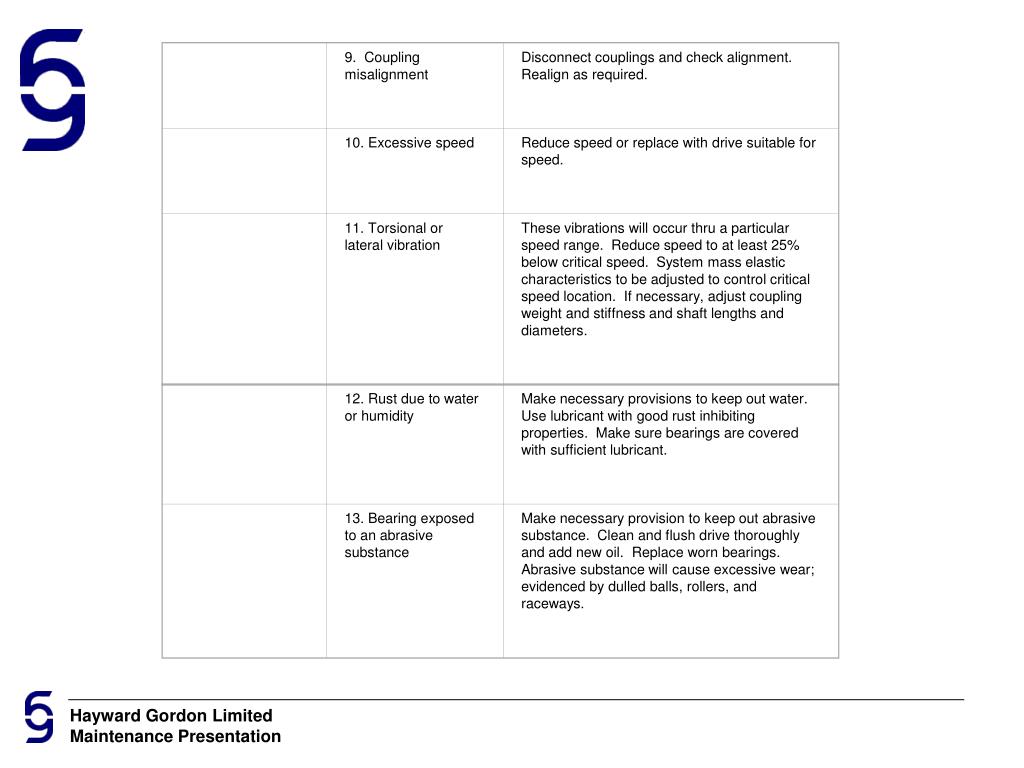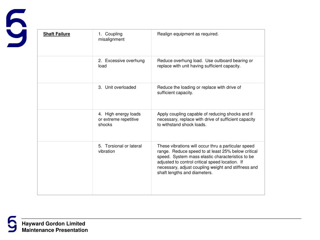 Shaft Failure 1.Coupling misalignment Realign equipment as required. 2.Excessive overhung load Reduce overhung load. Use outboard bearing or replace with unit having sufficient capacity. 3.Unit overloaded Reduce the loading or replace with drive of sufficient capacity. 4.High energy loads or extreme repetitive shocks Apply coupling capable of reducing shocks and if necessary, replace with drive of sufficient capacity to withstand shock loads. 5.Torsional or lateral vibration These vibrations will occur thru a particular speed range. Reduce speed to at least 25% below critical speed. System mass elastic characteristics to be adjusted to control critical speed location. If necessary, adjust coupling weight and stiffness and shaft lengths and diameters.