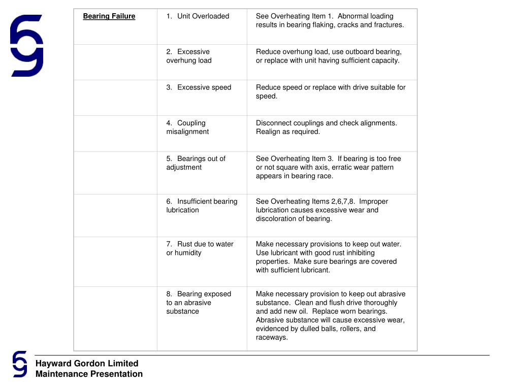 Bearing Failure 1.Unit Overloaded See Overheating Item 1. Abnormal loading results in bearing flaking, cracks and fractures. 2.Excessive overhung load Reduce overhung load, use outboard bearing, or replace with unit having sufficient capacity. 3.Excessive speed Reduce speed or replace with drive suitable for speed. 4.Coupling misalignment Disconnect couplings and check alignments. Realign as required. 5.Bearings out of adjustment See Overheating Item 3. If bearing is too free or not square with axis, erratic wear pattern appears in bearing race. 6.Insufficient bearing lubrication See Overheating Items 2,6,7,8. Improper lubrication causes excessive wear and discoloration of bearing. 7.Rust due to water or humidity Make necessary provisions to keep out water. Use lubricant with good rust inhibiting properties. Make sure bearings are covered with sufficient lubricant. 8.Bearing exposed to an abrasive substance Make necessary provision to keep out abrasive substance. Clean and flush drive thoroughly and add new oil. Replace worn bearings. Abrasive substance will cause excessive wear, evidenced by dulled balls, rollers, and raceways.